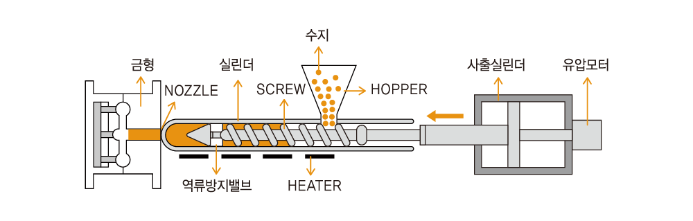 형틀에 부은 후 굳혀서 제품을 만들어내는 제작 방법입니다. 대량으로 생산되는 모든 형태의 플라스틱 제품들이